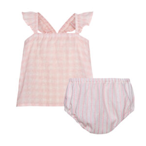Κατασκευασμένο από μαλακό ριπ ύφασμα που προσφέρει ελαστικότητα και άνεση στην κίνηση, ενώ τα διακοσμητικά κουμπιά στον ώμο διευκολύνουν την εφαρμογή και το ντύσιμο. Τα κοντά μανίκια με ελαφρύ βολάν προσθέτουν μία γλυκιά, κοριτσίστικη πινελιά.