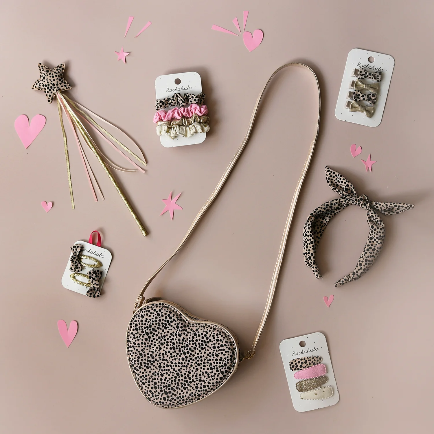 Περιλαμβάνει το χαρακτηριστικό μας λεοπάρ σχέδιο, έντονο ροζ, χρυσή λάμψη και εκρού ύφασμα με διασκορπιστά αστέρια – τα απόλυτα scrunchies για μικρές λάτρεις των λεοπάρ!