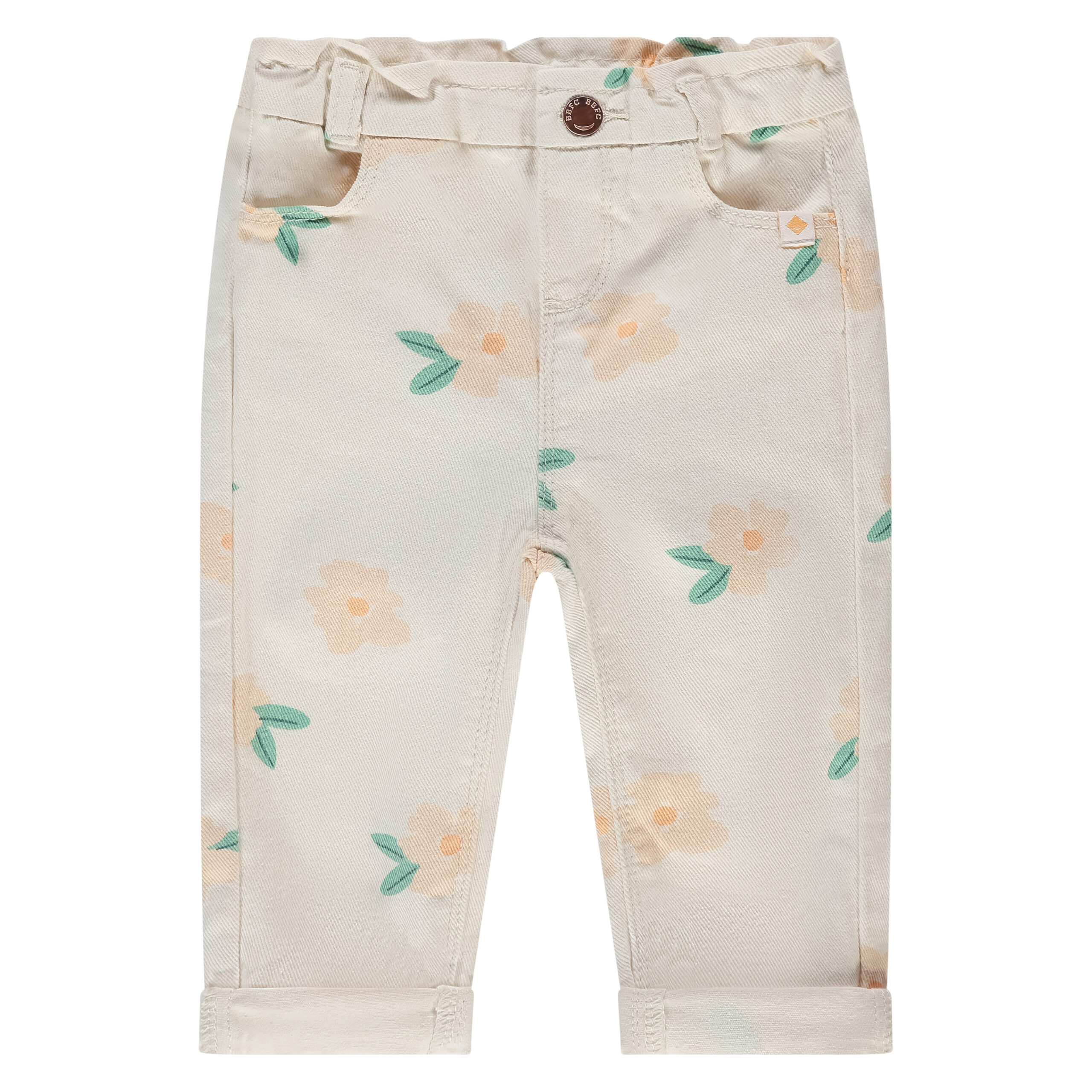 Μαλακό βρεφικό παντελόνι μπεζ με λουλούδια και λάστιχο στο πάνω μέρος.