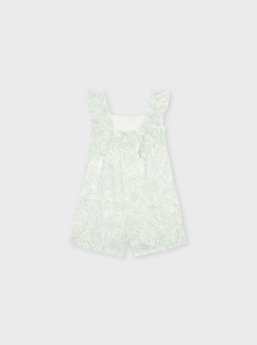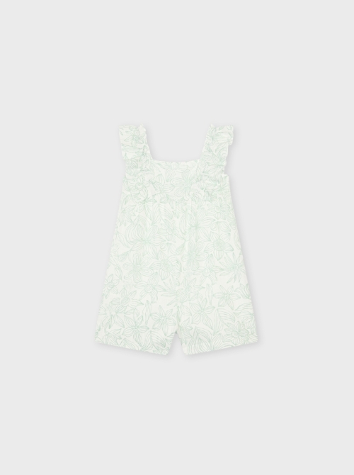 Βρεφική ολόσωμη αμάνικο φόρμα-σορτς σε λευκό χρώμα με φυστικί λουλούδια, βολάν στους ώμους και σφηκοφωλιά στο πίσω μέρος.