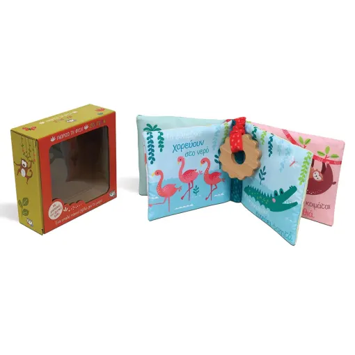 Αυτό το υπέροχο βιβλίο διεγείρει τις αισθήσεις του μωρού, που αγγίζει τις απαλές πάνινες σελίδες, ακούει τον ήχο του εξωφύλλου, βλέπει τις πανέμορφες εικόνες των ζώων της ζούγκλας και παίζει με το μασητικό από φυσικό ξύλο.