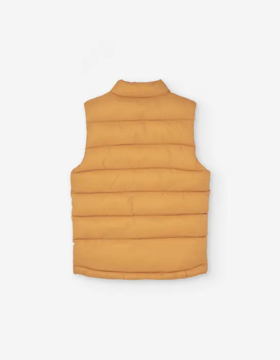 Αμάνικο μπουφάν σε μουσταρδί χρώμα με φερμουάρ και τσέπες.