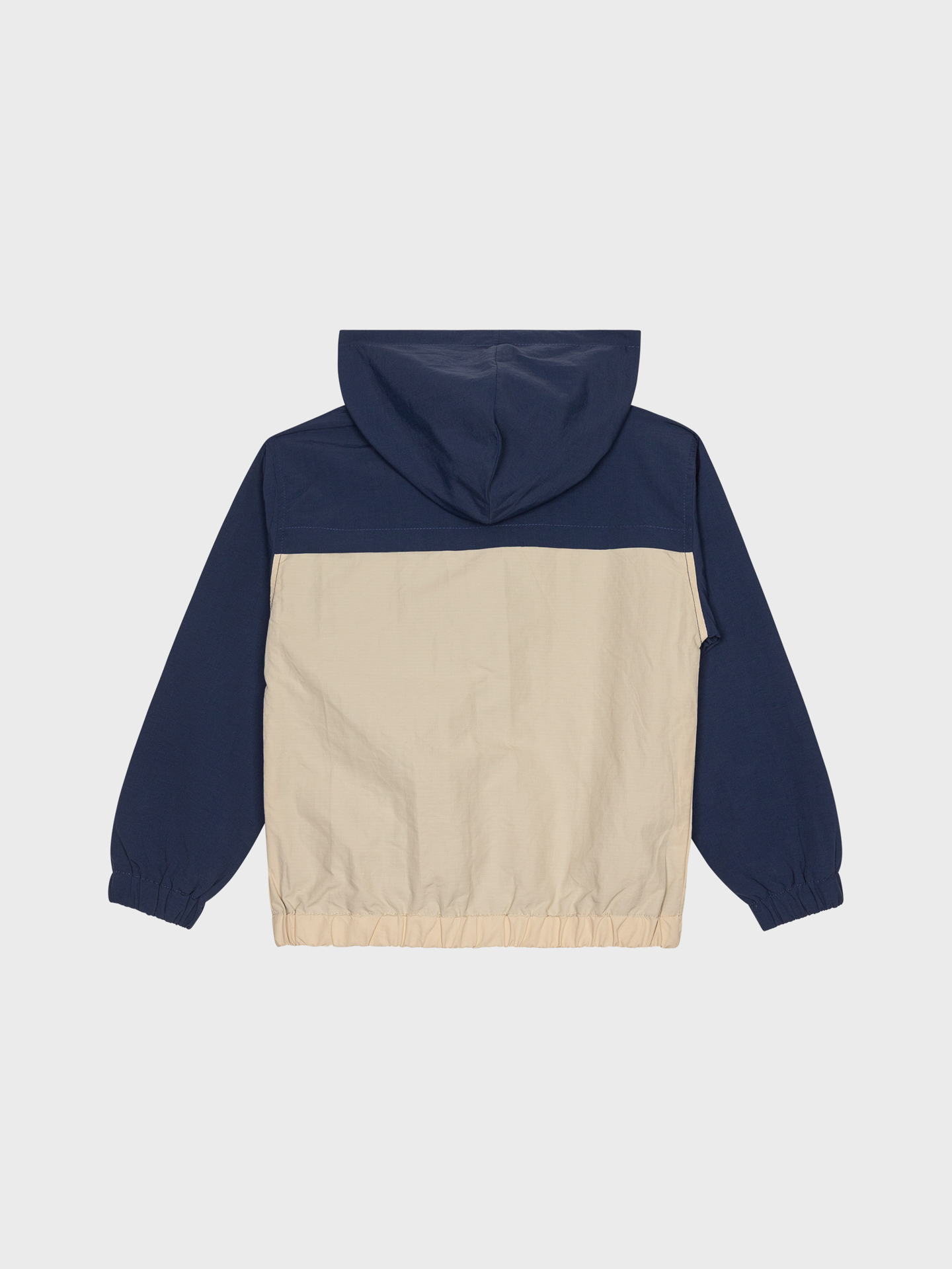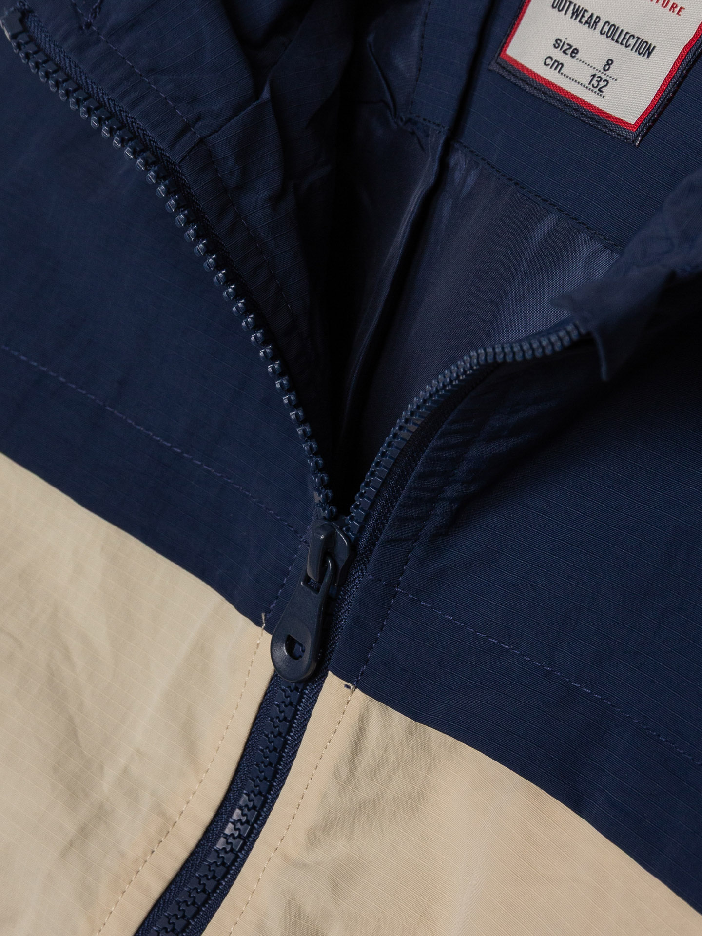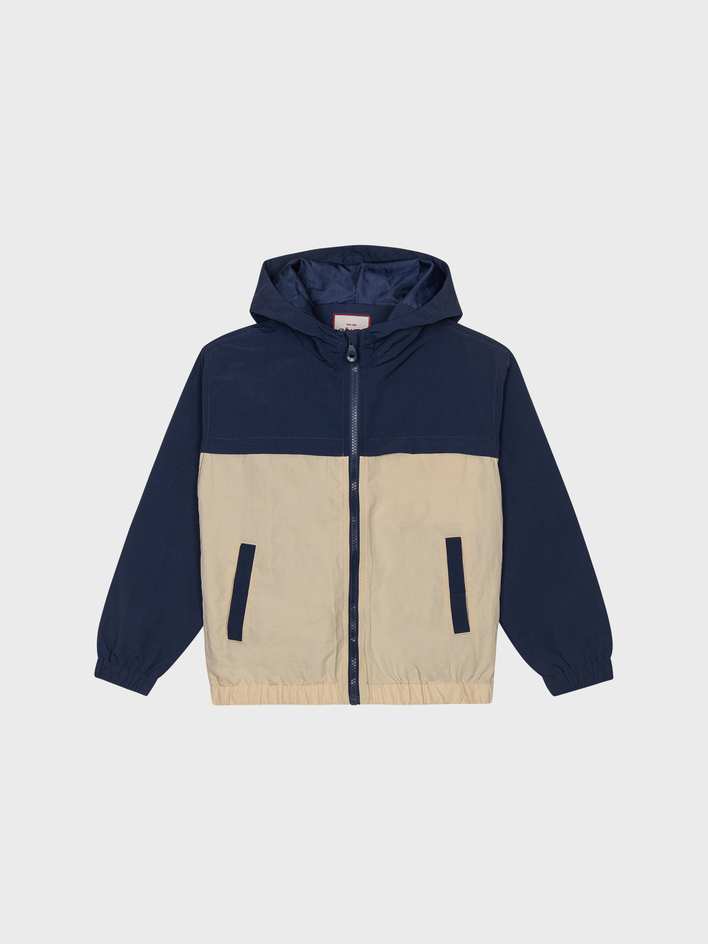 Πρακτικό και μοντέρνο παιδικό αντιανεμικό μπουφάν σε συνδυασμό navy και beige αποχρώσεων, ιδανικό για τις μεταβατικές εποχές. Ο δίχρωμος σχεδιασμός χαρίζει σύγχρονο στυλ, ενώ η κουκούλα προσφέρει επιπλέον προστασία από τον αέρα και την ελαφριά βροχή.
