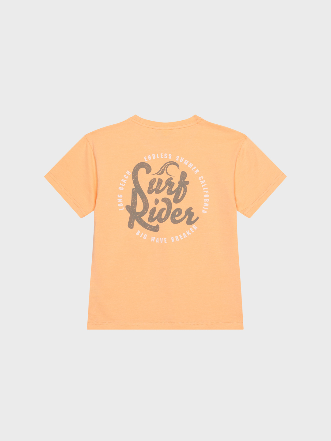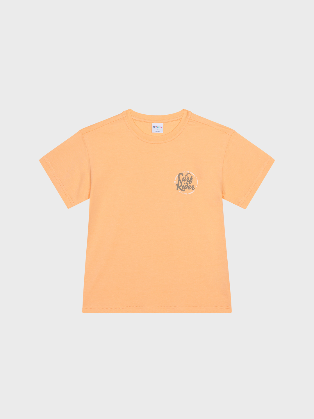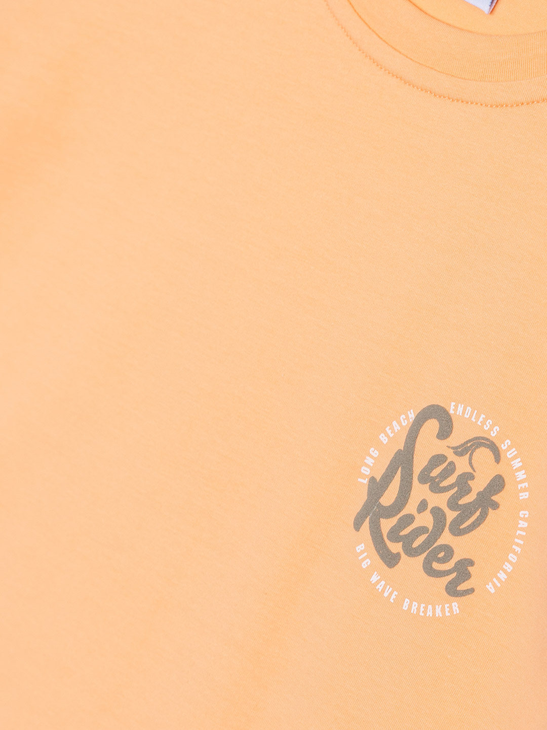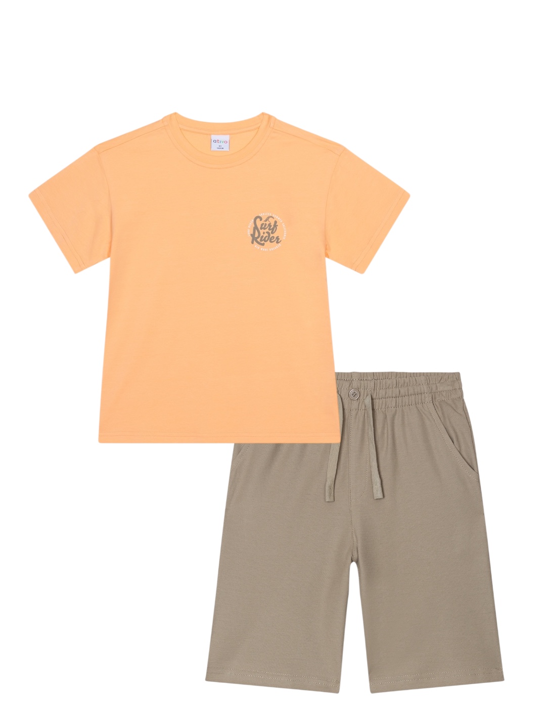 Μοντέρνο παιδικό καλοκαιρινό σετ που αποτελείται από κοντομάνικο t-shirt και άνετο σορτς, ιδανικό για καθημερινές εμφανίσεις και δραστηριότητες. Το πορτοκαλί t-shirt διαθέτει διακριτικό τύπωμα στο στήθος που προσθέτει στυλ και παιχνιδιάρικη διάθεση.
