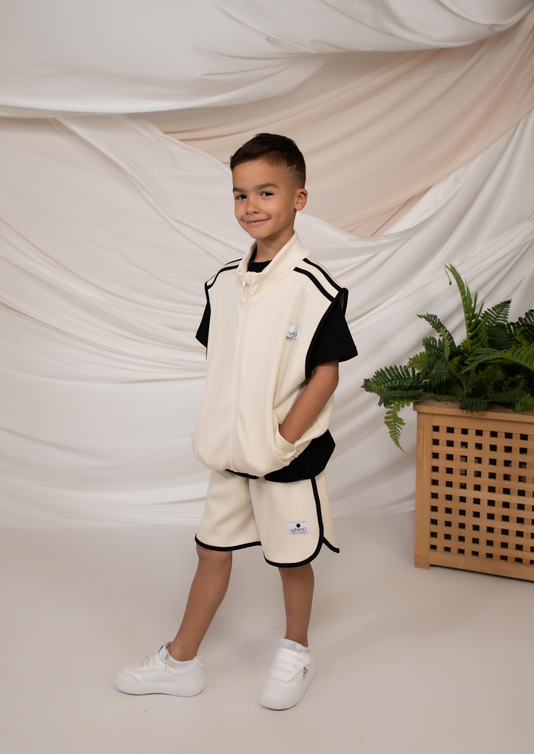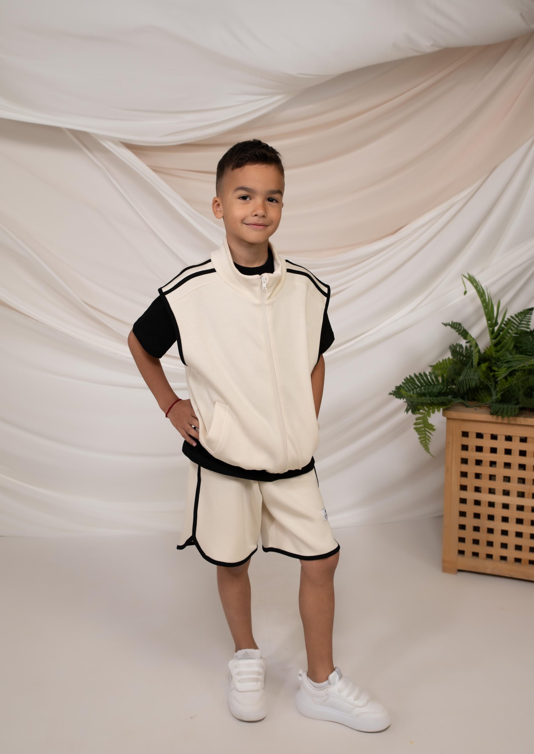 Σετ καλοκαιρινό με μοντέρνο και άνετο σχεδιασμό, ιδανικό για καθημερινές εμφανίσεις. Αποτελείται από αμάνικο ζακετάκι με φερμουάρ σε εκρού χρώμα, που προσθέτει στυλ και ευκολία στο ντύσιμο και σορτσάκι σε ασορτί απόχρωση, με διακριτικές μαύρες λεπτομέρειες στα τελειώματα.