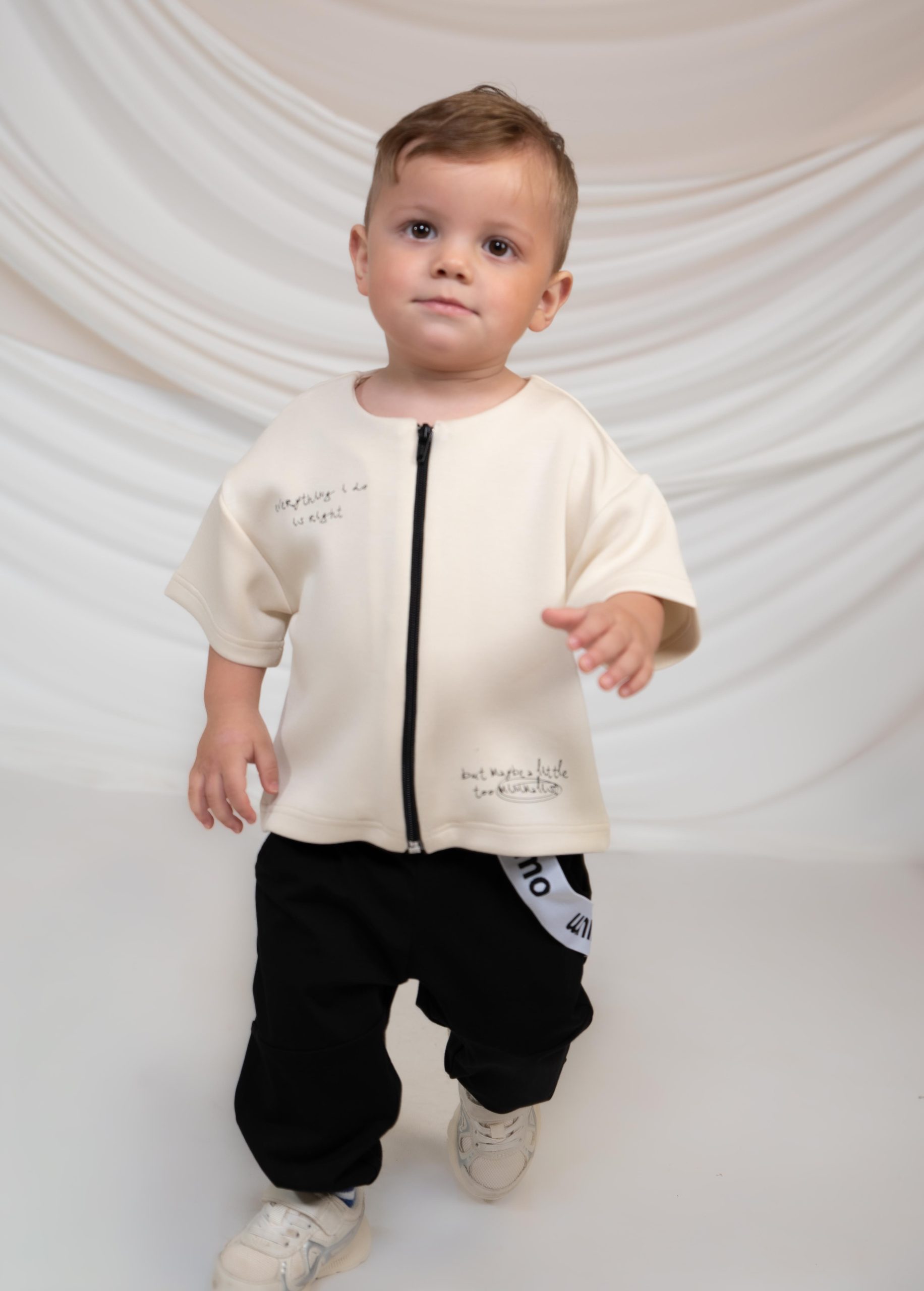 Σετ με μοντέρνο και άνετο σχεδιασμό, ιδανικό για καθημερινές εμφανίσεις με στυλ. Αποτελείται από κοντομάνικο μπλουζάκι/ζακετάκι σε εκρού απόχρωση με φερμουάρ στο μπροστινό μέρος και διακριτικά prints, που προσθέτουν μια ιδιαίτερη πινελιά. Συνδυάζεται με παντελόνι σε μαύρο χρώμα με χαλαρή εφαρμογή και μοντέρνες λεπτομέρειες.