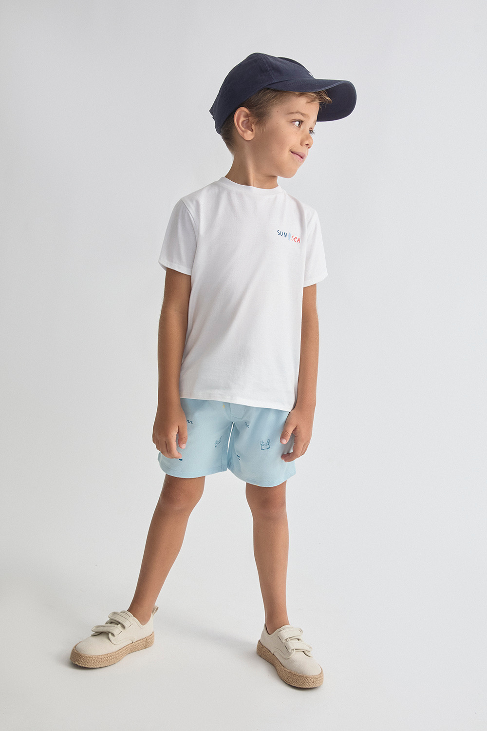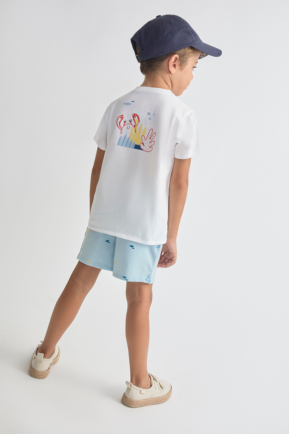 Σετ λευκή κοντομάνικη μπλούζα με σχέδιο στην πλάτη και γαλάζια βερμούδα.