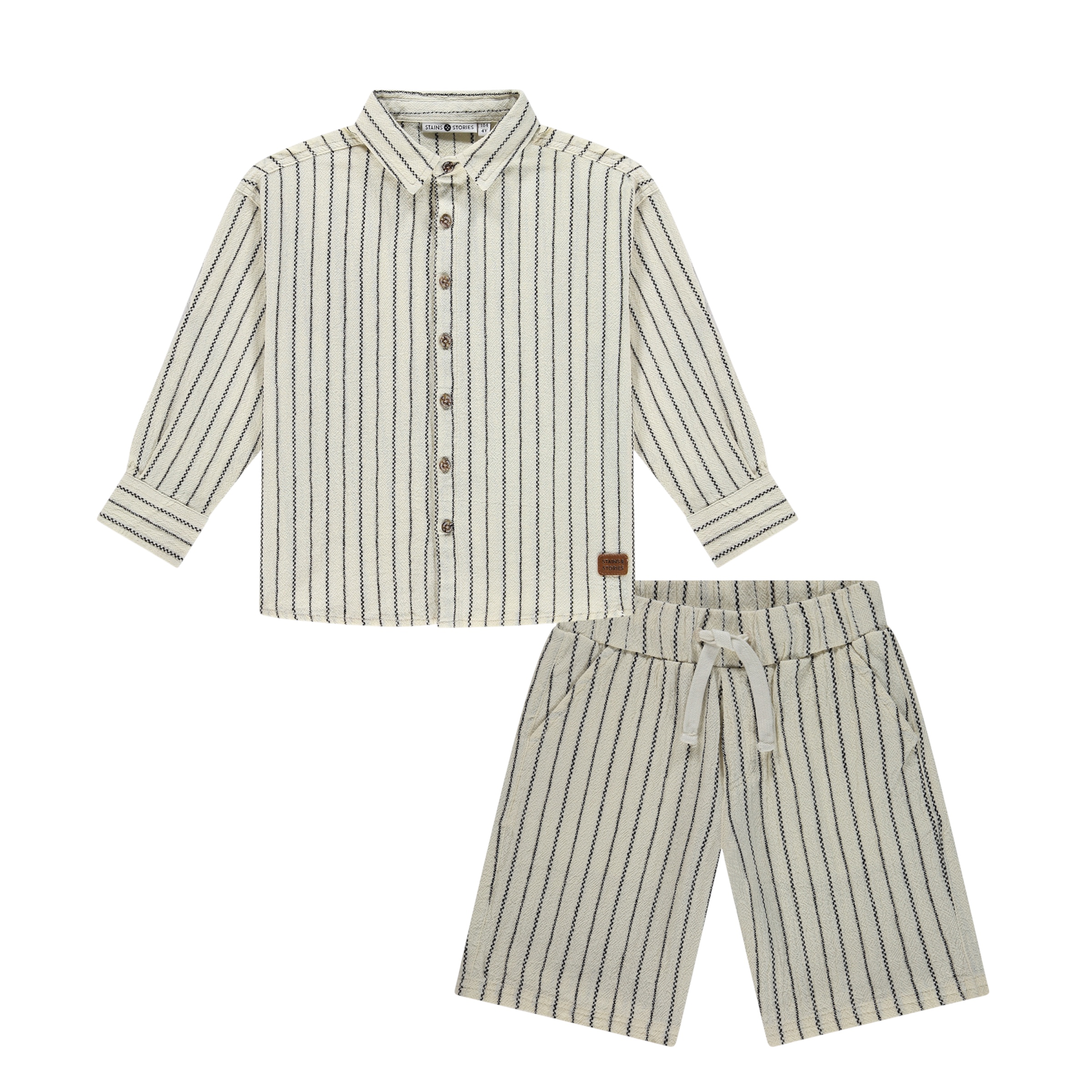 Κομψό και άνετο παιδικό σετ που αποτελείται από ριγέ πουκάμισο και βερμούδα σε off white απόχρωση. Το σετ ξεχωρίζει για το διαχρονικό ριγέ σχέδιο που χαρίζει ένα κομψό αλλά και casual καλοκαιρινό στυλ.