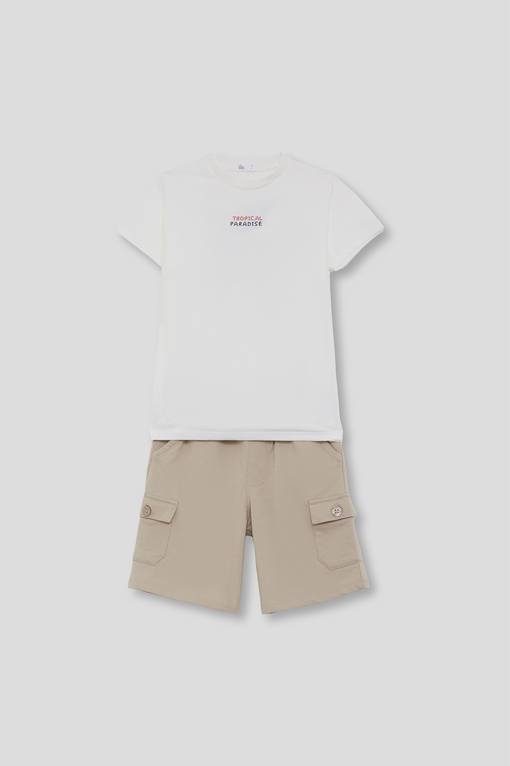 Σετ λευκή μπλούζα με σχέδιο στην πλάτη και μπεζ βερμούδα σε άνετη γραμμή.
