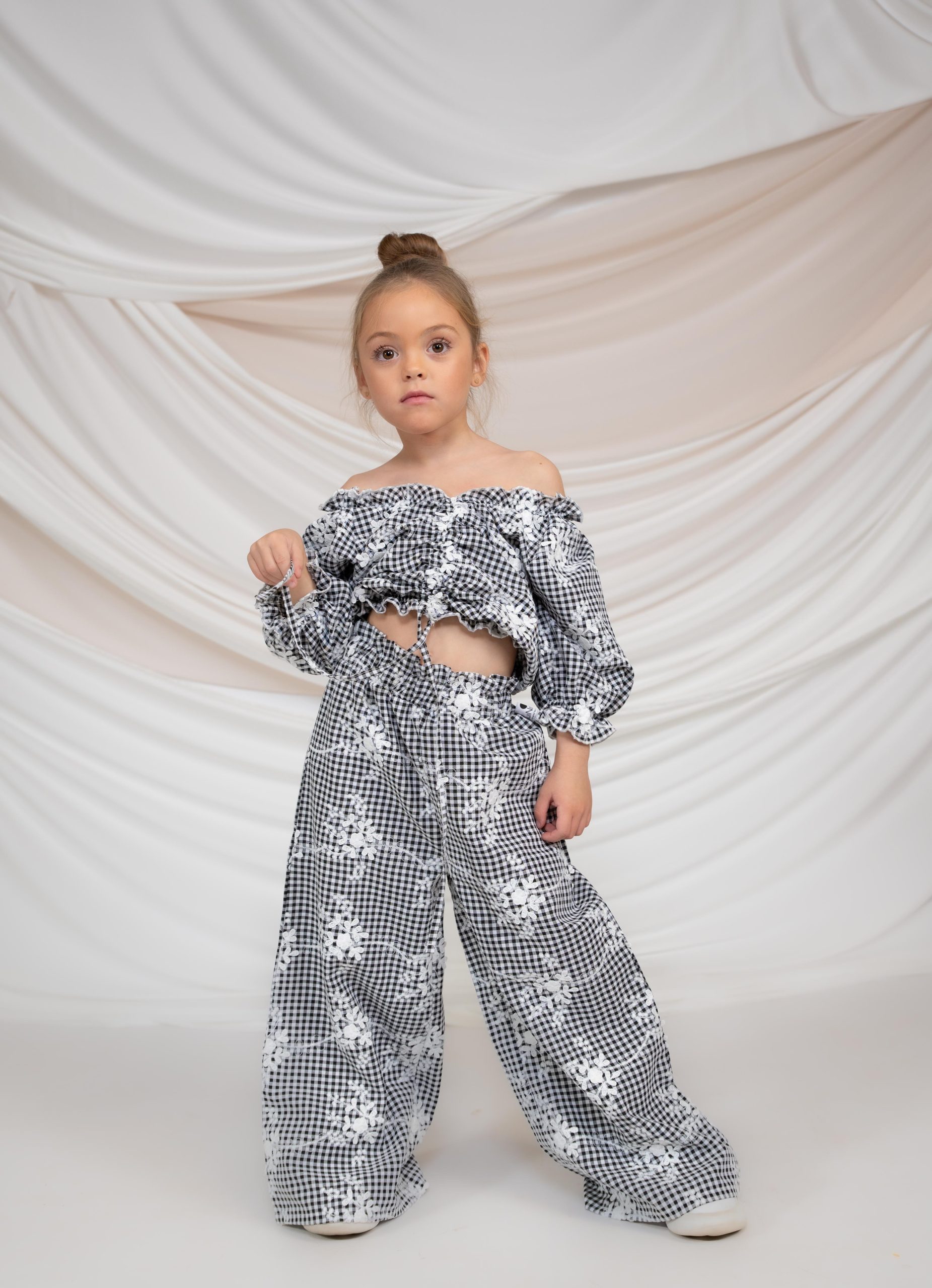 Σετ 2 τεμαχίων καρό με έξωμο τοπ με λεπτομέρειες βολάν και φαρδιά παντελόνα.