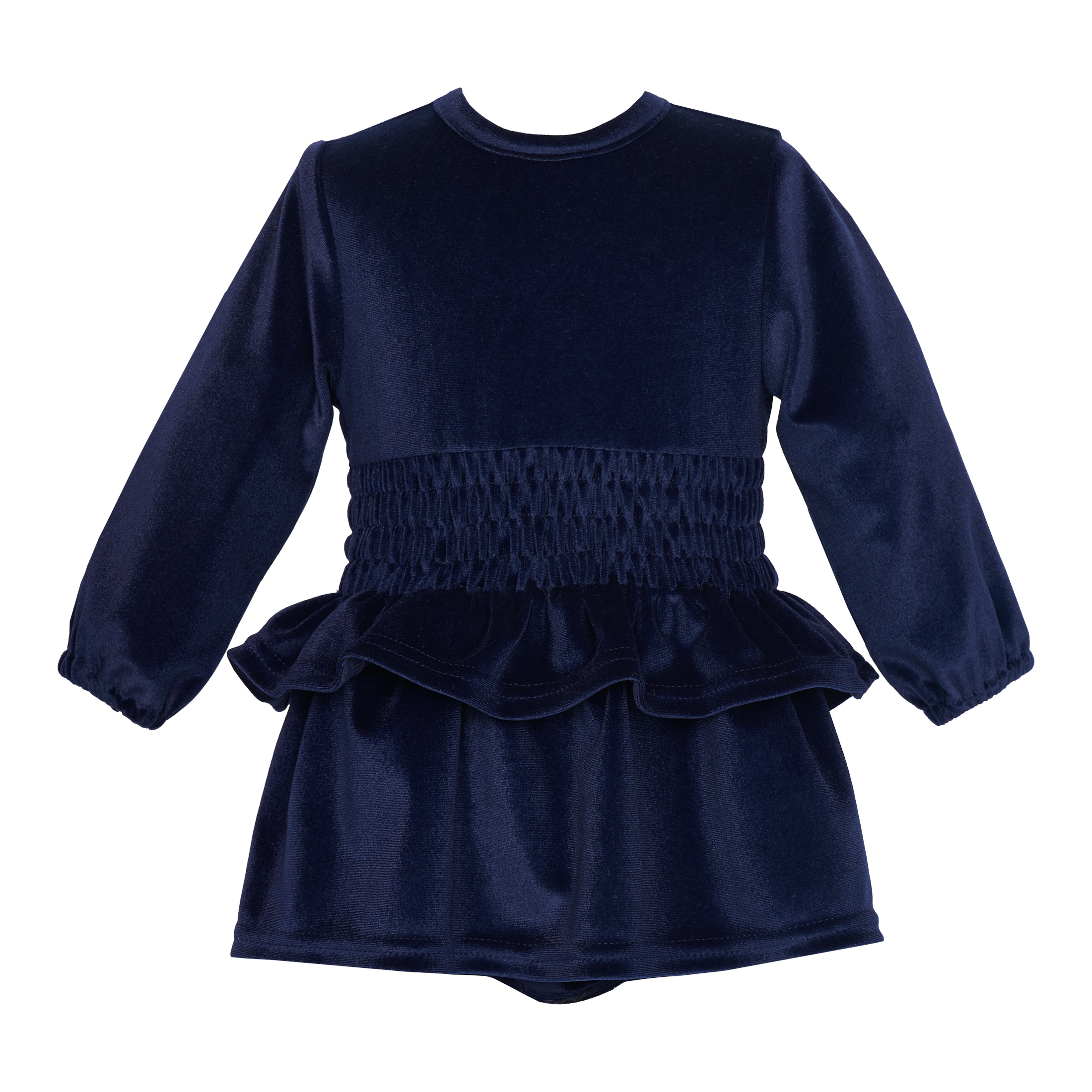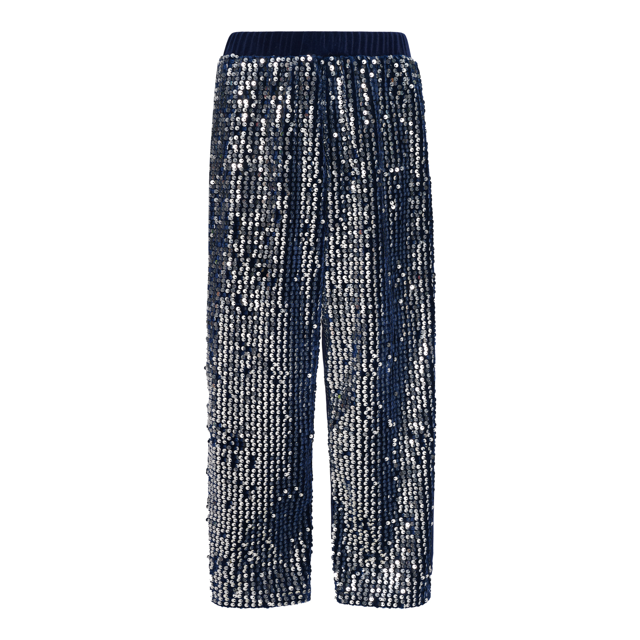 Σετ μπλε βελούδινη μπλούζα με σφηκοφωλιά στην μέση & παντελόνα από παγιέτες.