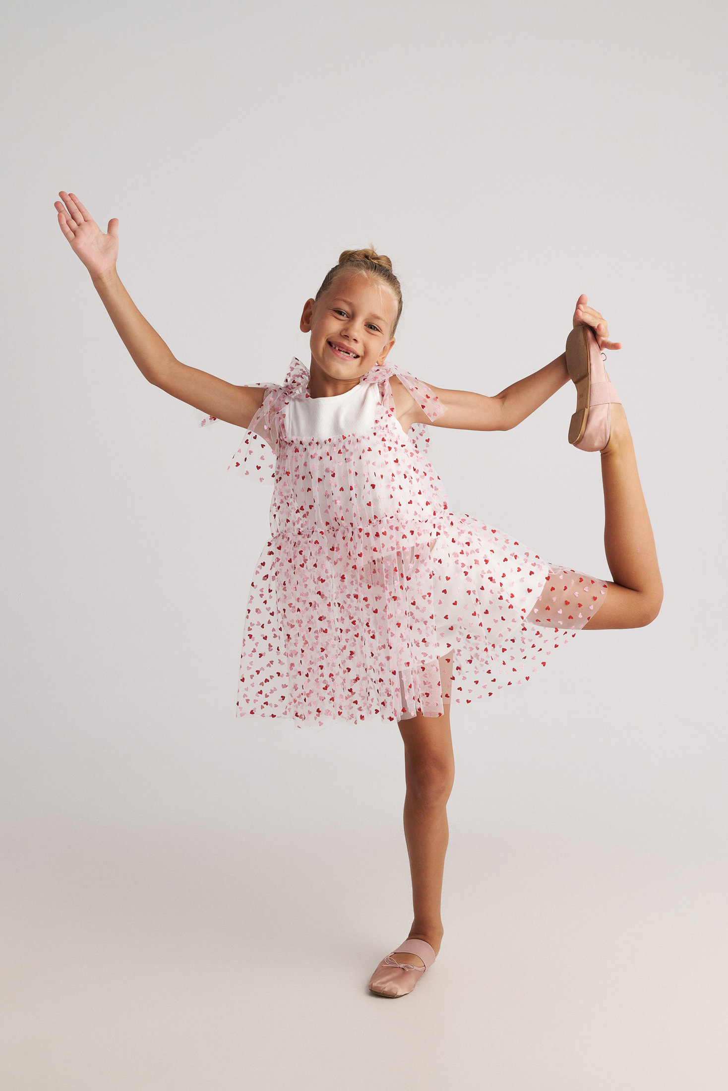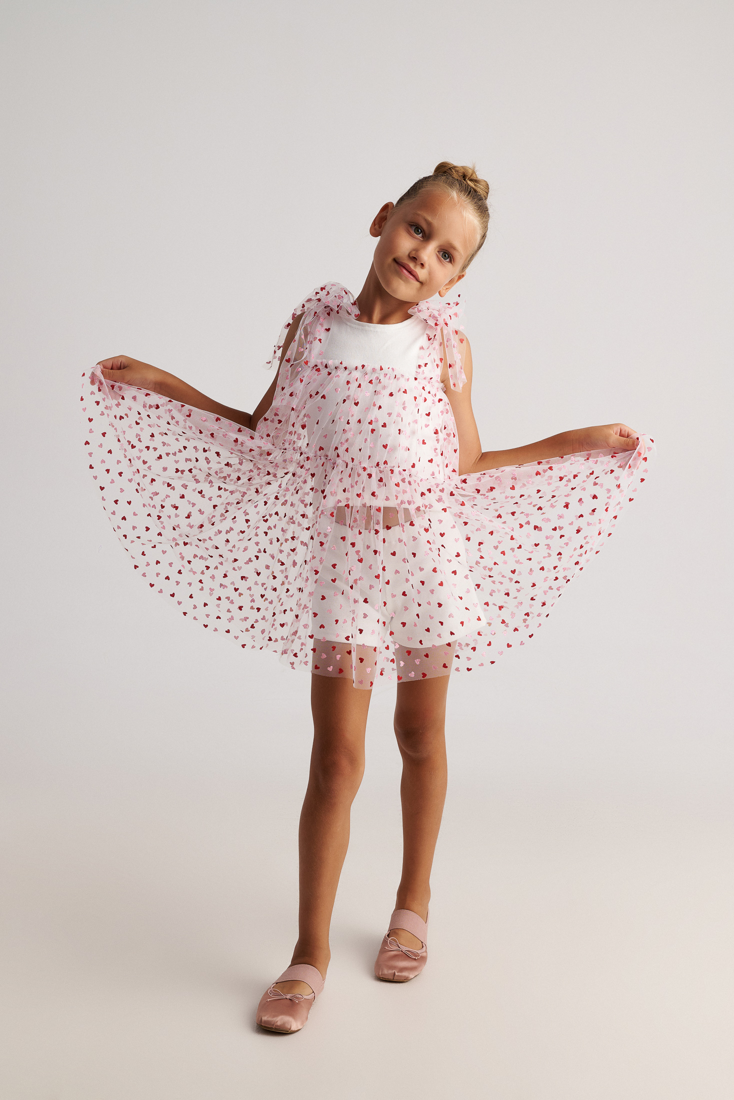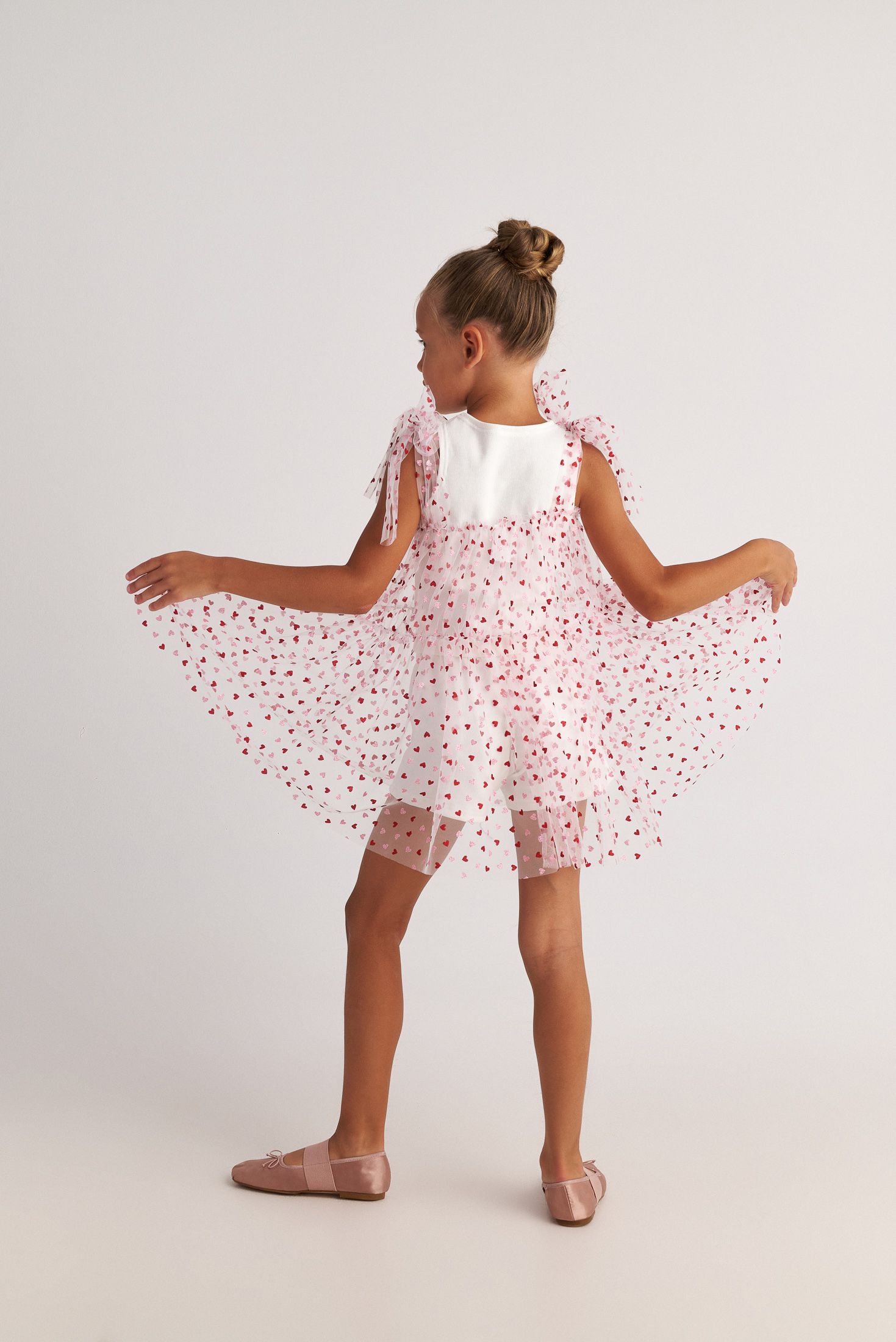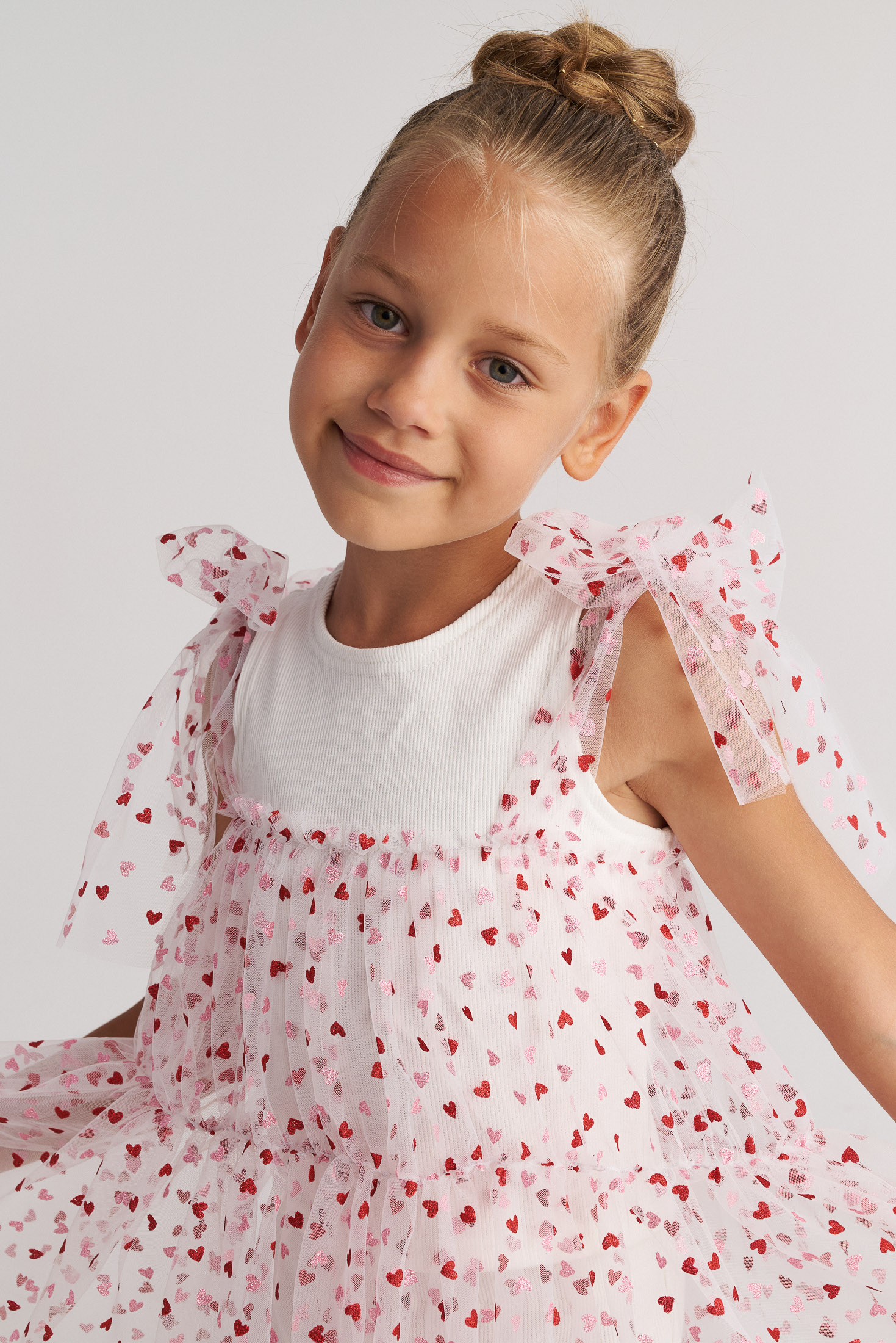 Σετ καρδουλένιο 3 τεμαχίων, αποτελείται από λευκό αμάνικο κροπ τοπ ριπ και ασορτί σορτς & τούλινο ημιδιάφανο φόρεμα από πάνω με κόκκινες και ροζ καρδούλες.