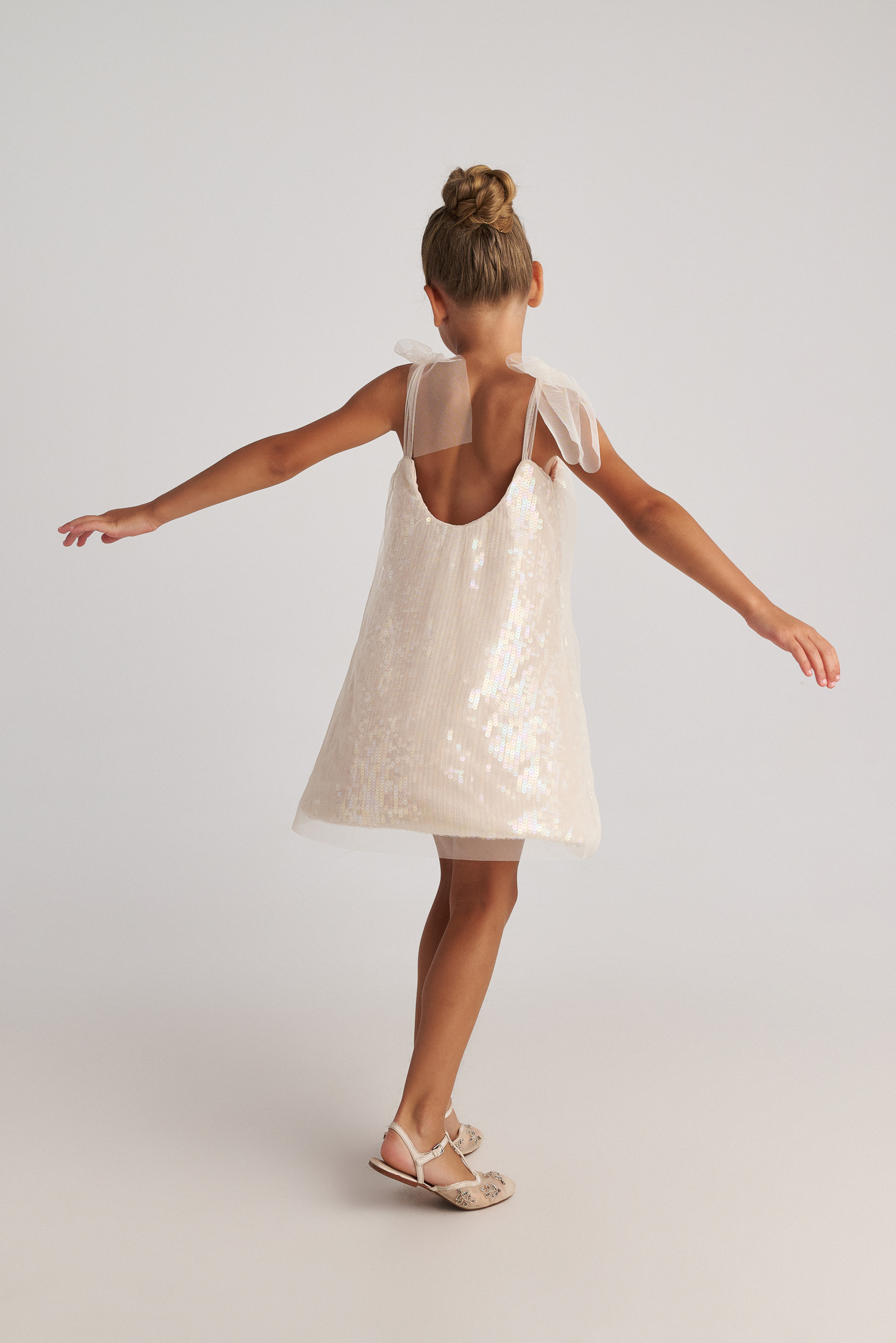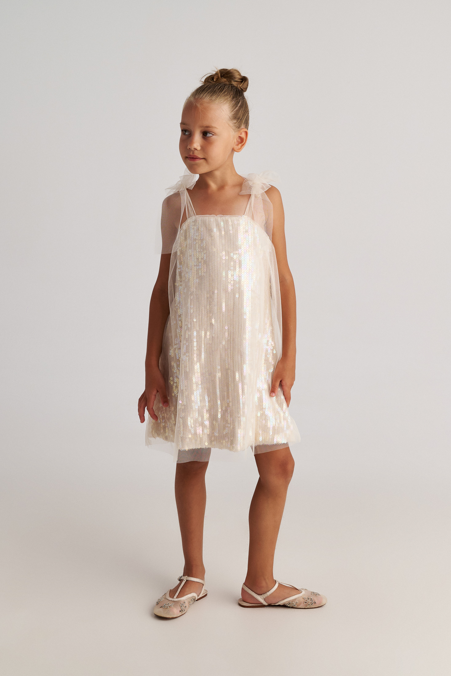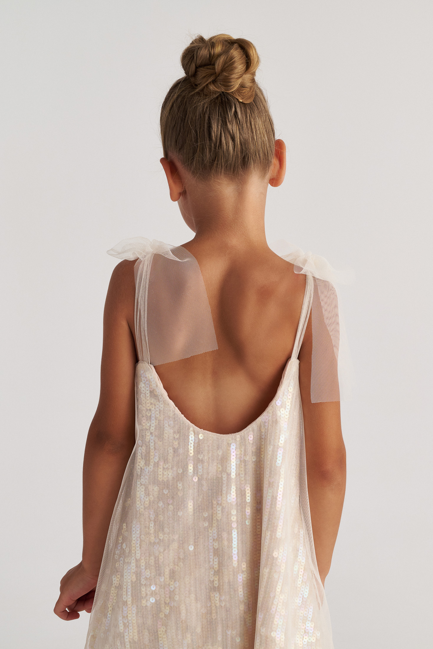 Φόρεμα σε ίσια γραμμή με nude παγιέτες και μπεζ τούλι.