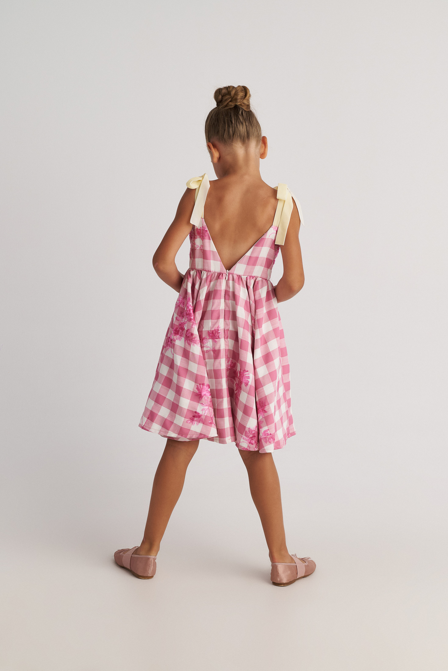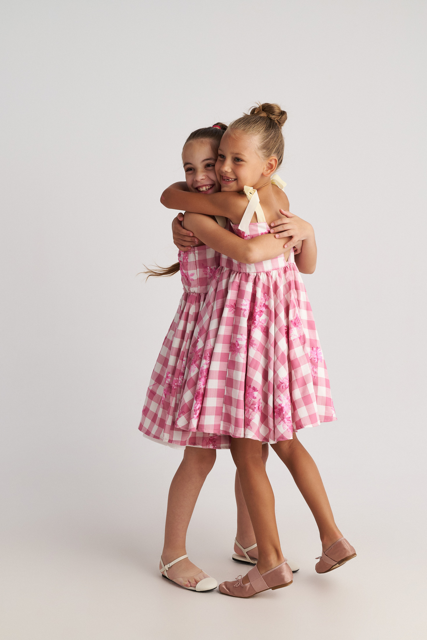 Ροζ καρό φόρεμα με τέλεια κίνηση και κεντημένες παγιέτες. Δένει στους ώμους και έχει άνοιγμα στην πλάτη.