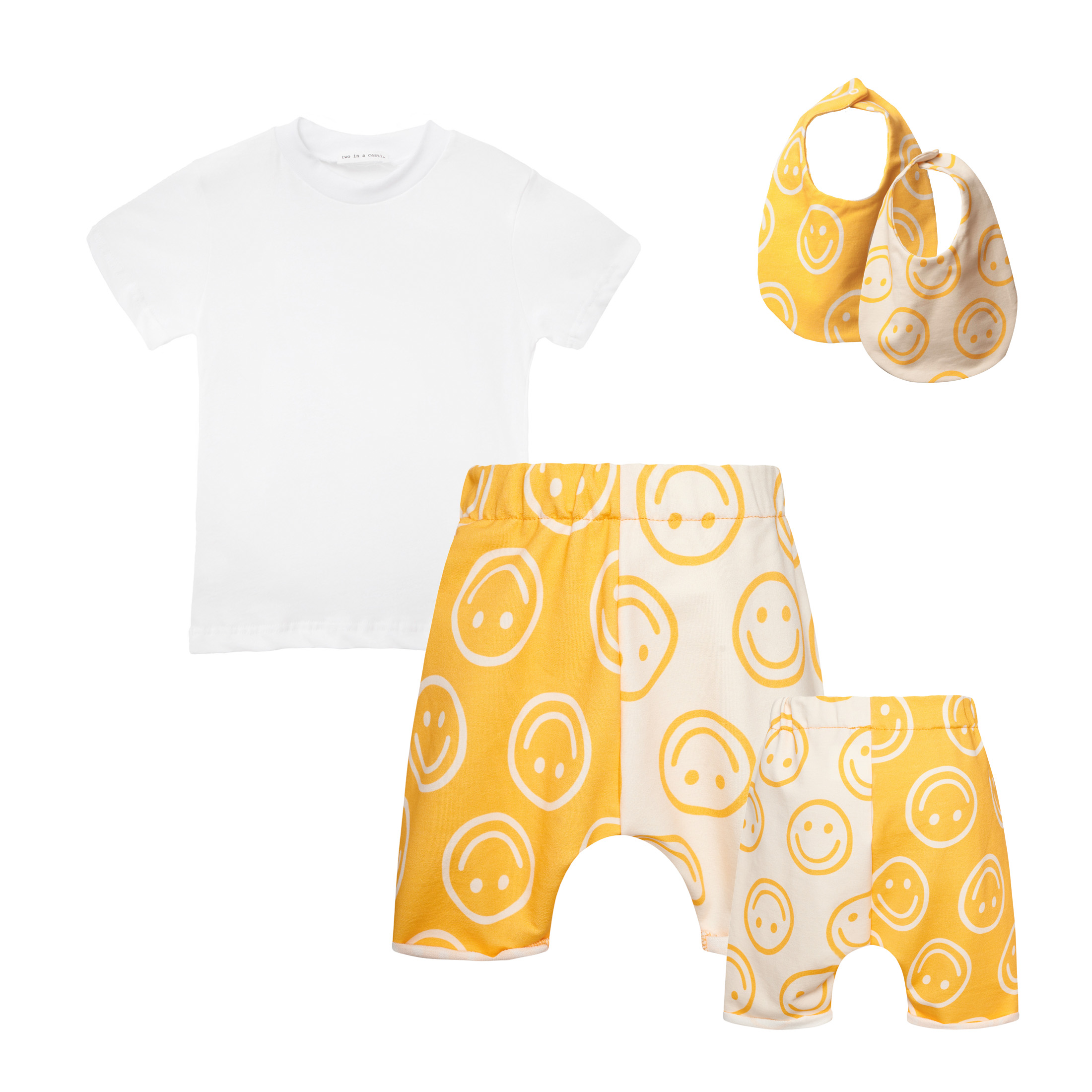 Βρεφικό σετ με κοντομάνικο και παντελόνι βράκα. Διαθέτει δύο σαλιάρες με το ίδιο μοτίβο
