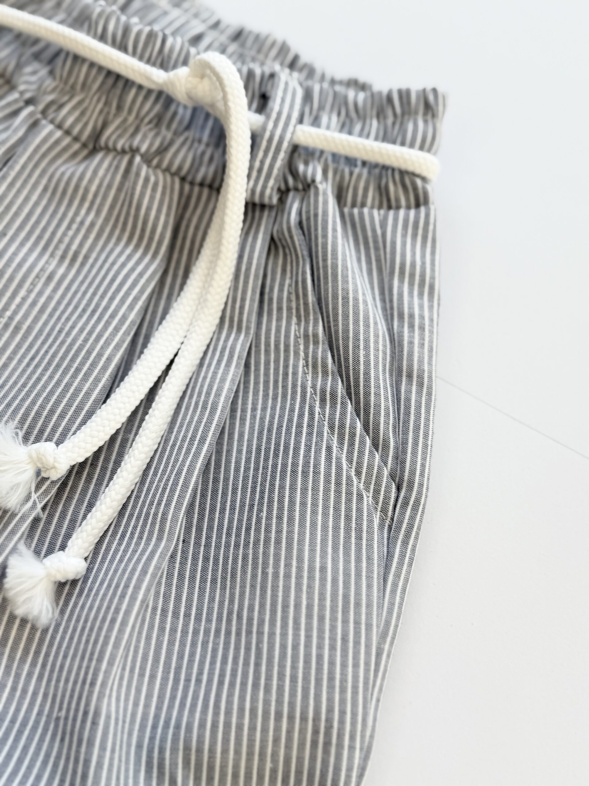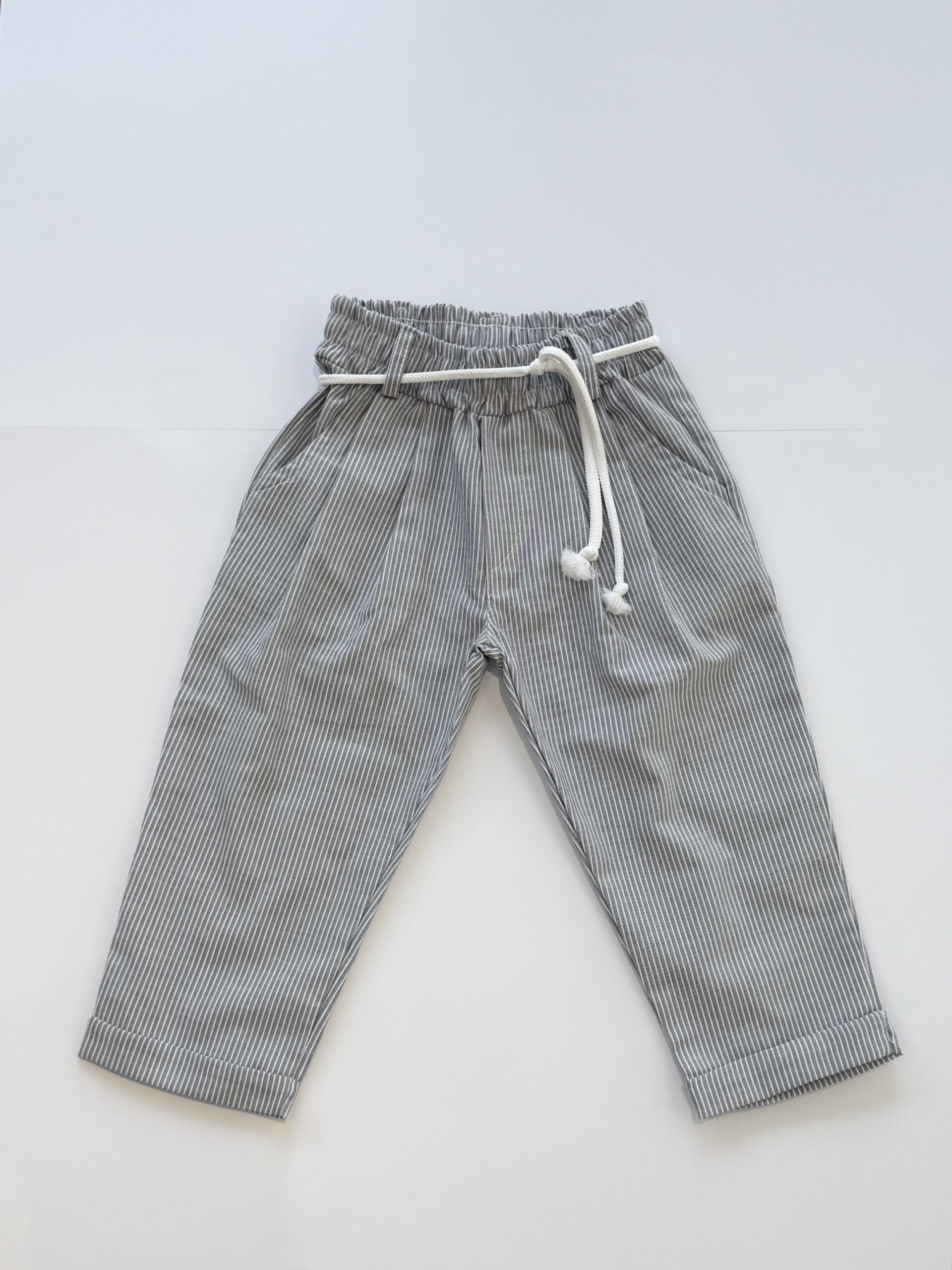 Παντελόνι σε μπλε απόχρωση με λευκές ρίγες στο ενδιάμεσο. Διαθέτει λάστιχο στο πάνω μέρος για καλύτερη εφαρμογή και κορδόνι λευκό αποσπώμενο για ζωνάκι.