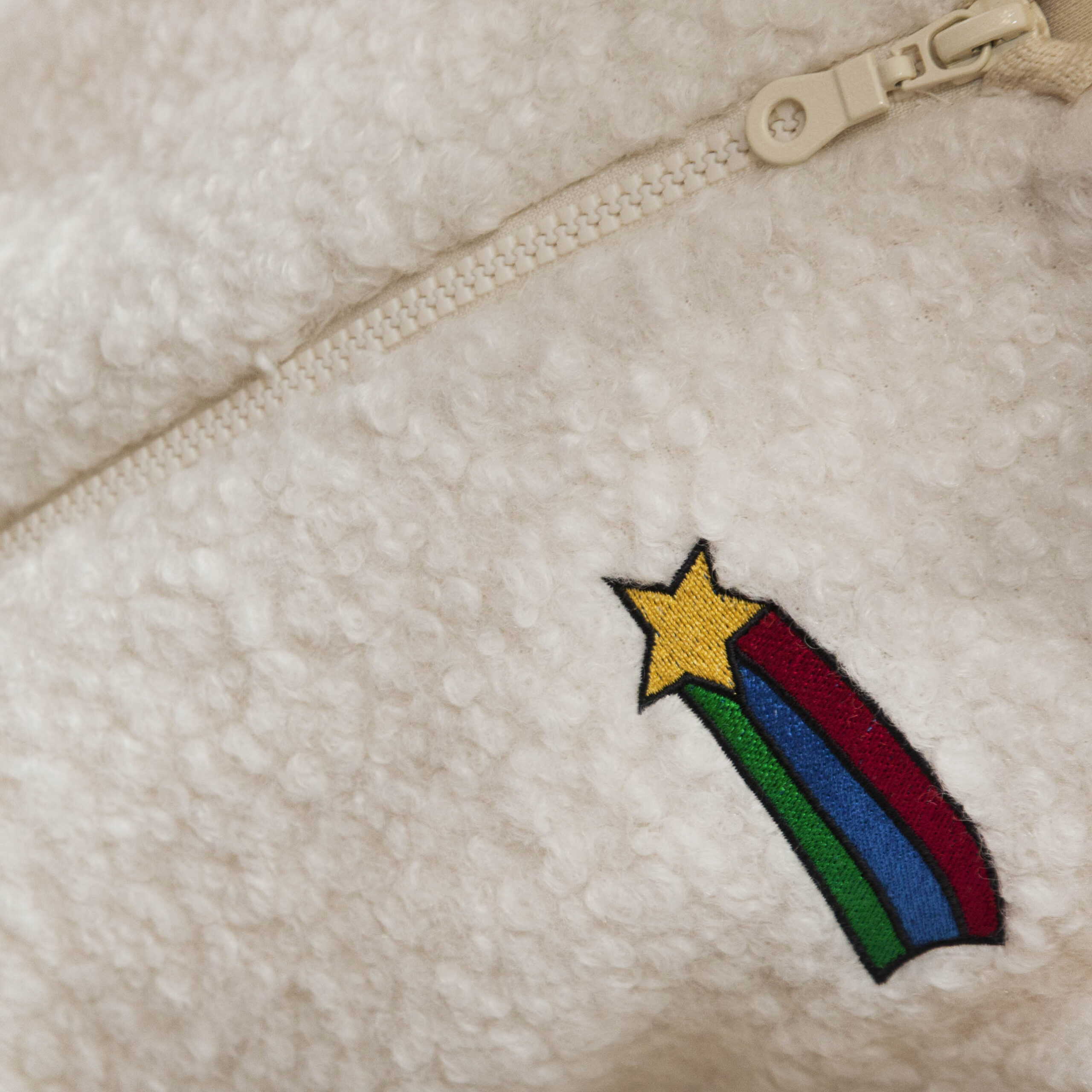Βρεφικό τζάκετ γούνινο με ενσωματωμένη κουκούλα και χρωματικές λεπτομέρειες στα μανίκια. Κλείνει με φερμουάρ.