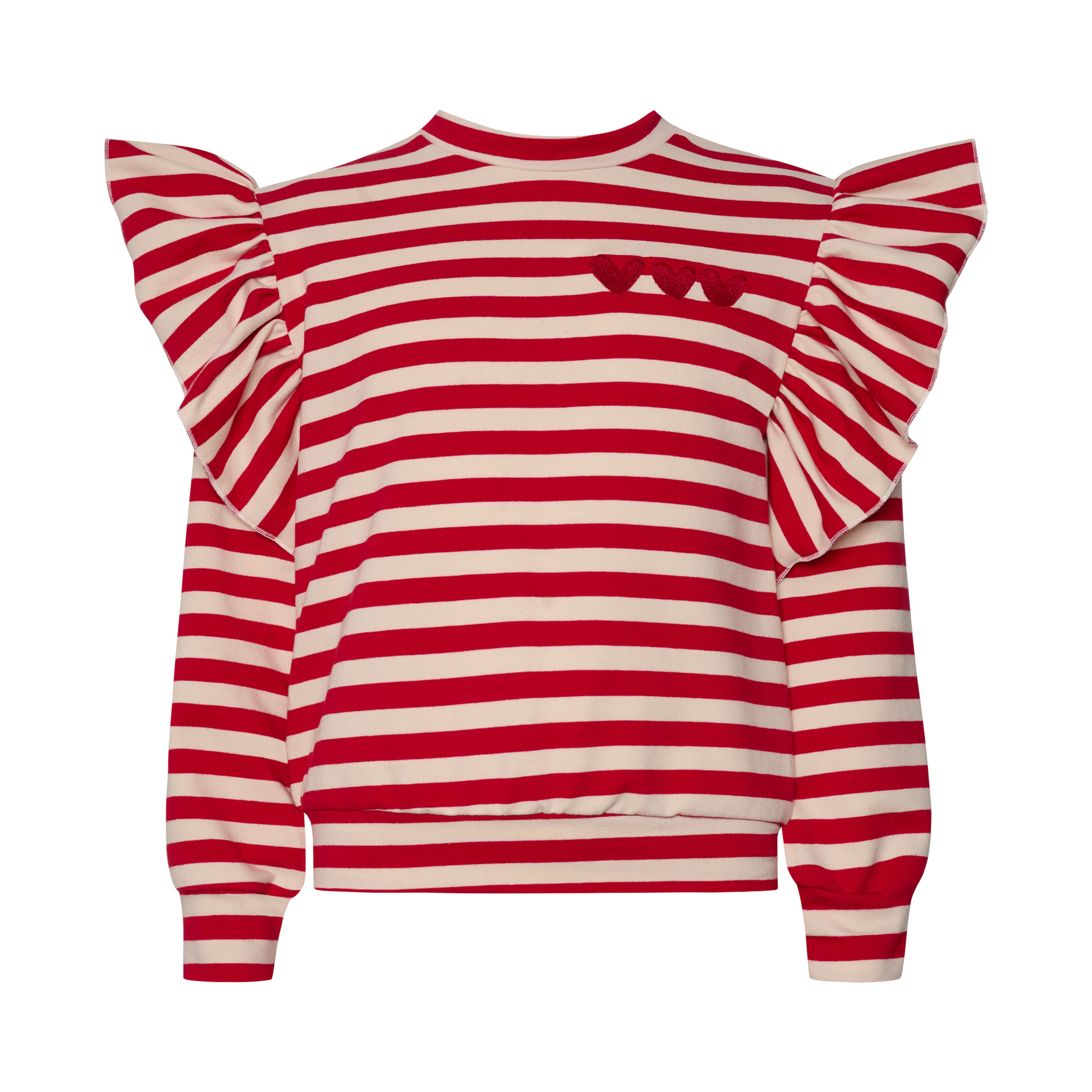 Μπλούζα ριγέ με κεντημένες καρδιές στο πέτο, στρογγυλή λαιμόκοψη και βολάν στους ώμους.