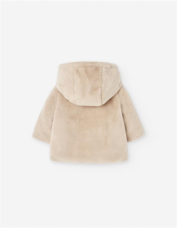 Γούνινο παλτό σε μπεζ χρώμα με ενσωματωμένη κουκούλα. Διαθέτει φόδρα πουά και κλείνει με κρυφά κουμπάκια.
