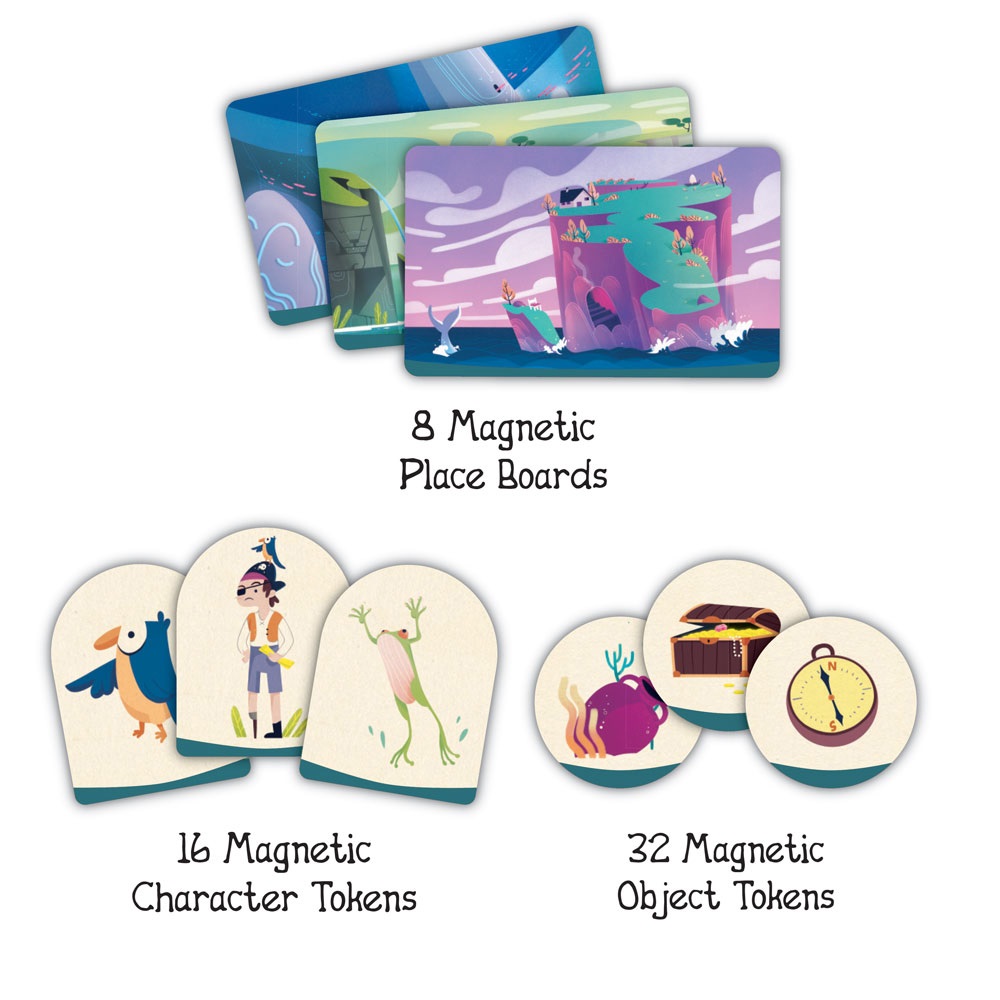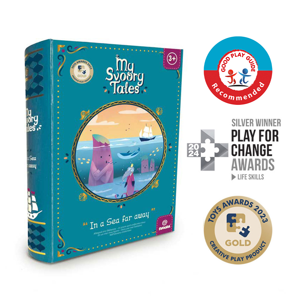 Ταξιδέψτε στον υπέροχο κόσμο της έμπνευσης και αφήγησης των παραμυθιών με το παιχνίδι «SvooryTales»! Ένα πρωτότυπο και άκρως δημιουργικό παιχνίδι που ακολουθεί τη σχεδιαστική δομή ενός παραδοσιακού vintage βιβλίου. Στο εσωτερικό του υπάρχουν 3 σελίδες οι οποίες αντιστοιχούν στα 3 στάδια αφήγησης: Εισαγωγή, Προϊδέαση-Διήγηση και Λύση. Στη συσκευασία περιλαμβάνονται μαγνήτες που μπορούν να επιλεγούν τυχαία και να τοποθετηθούν σε αυτές τις σελίδες. Με βάση τα εικονιζόμενα στοιχεία ο αφηγητής δημιουργεί διάφορες ιστορίες, η καθεμία με τη δική της ξεχωριστή πλοκή ή με αμέτρητες εναλλακτικές εκδοχές! Με αυτόν τον τρόπο, καλλιεργείται η προσδοκία στους μικρούς ακροατές να περιμένουν κάτι μαγικό να συμβεί, που σίγουρα δεν θα είναι ποτέ το ίδιο καθώς οι δυνατότητες της ιστορίας είναι άπειρες! Είναι ιδανικό για παιδιά άνω των 3 ετών ενώ ταυτόχρονα αποτελεί ένα πολύ χρήσιμο εργαλείο για γονείς, εκπαιδευτικούς, συμβούλους και λογοθεραπευτές. Εξαιρετικά πρωτότυπο, κατασκευασμένο από ασφαλή υλικά και με μοντέρνες πινελιές στο σχεδιασμό του, περιέχει 8 μαγνήτες με τοποθεσίες, 16 με χαρακτήρες και 32 με αντικείμενα, που βρίσκονται με ασφάλεια αποθηκευμένοι σε βαμβακερή θήκη. Περιλαμβάνεται επίσης ένας γράψε-σβήσε μαρκαδόρος που καθιστά δυνατή τη γραφή στις σελίδες με τις γραμμές όλων των φανταστικών ονομάτων αλλά και των επιμέρους χαρακτηριστικών των εικόνων.