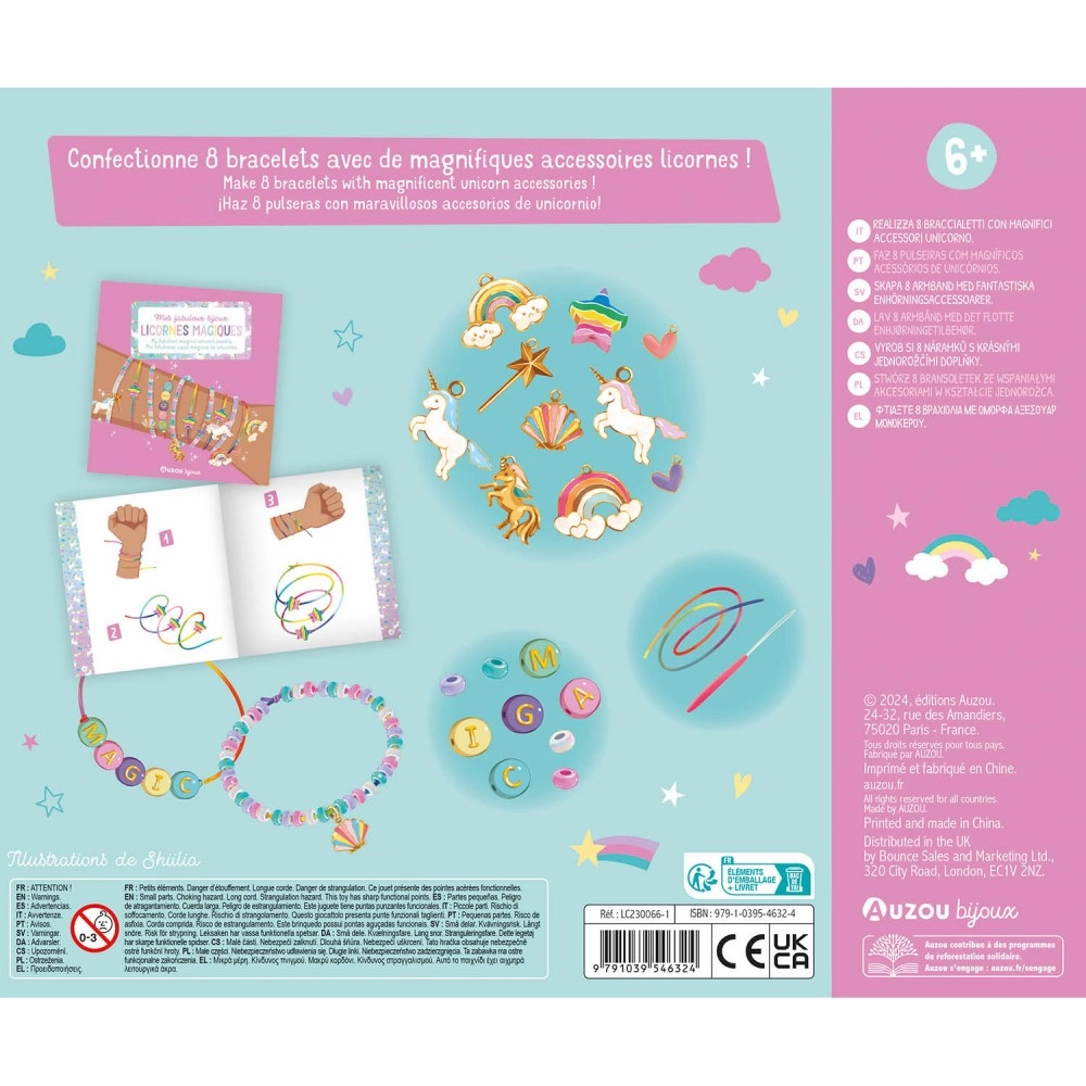 Γνωρίστε την ικανοποίηση και την απόλαυση του να φοράτε ένα κόσμημα που έχετε φτιάξει μόνοι σας! Η σειρά «Φτιάχνω Κοσμήματα», της αγαπημένης μας γαλλικής εταιρίας Auzou, διαθέτει μεγάλη γκάμα από πρωτότυπα, μοντέρνα και δημιουργικά κιτ κατασκευής κοσμημάτων. Βραχιόλια, κολιέ, δαχτυλίδια και πολλά άλλα, ανακαλύψτε τα όλα και δημιουργήστε τις πιο μοναδικές και καταπληκτικές συλλογές αξεσουάρ και κοσμημάτων! Το συγκεκριμένο κιτ περιλαμβάνει όλα όσα θα χρειαστείτε για να φτιάξετε 8 βραχιολάκια διακοσμημένα με υπέροχους μονόκερους, που μπορείτε να συνδυάσετε και να φορέσετε όλα μαζί ή να τα μοιράσετε σε όλες τις αγαπημένες σας φίλες! Περιλαμβάνεται φυλλάδιο με αναλυτικές οδηγίες βήμα-βήμα.
