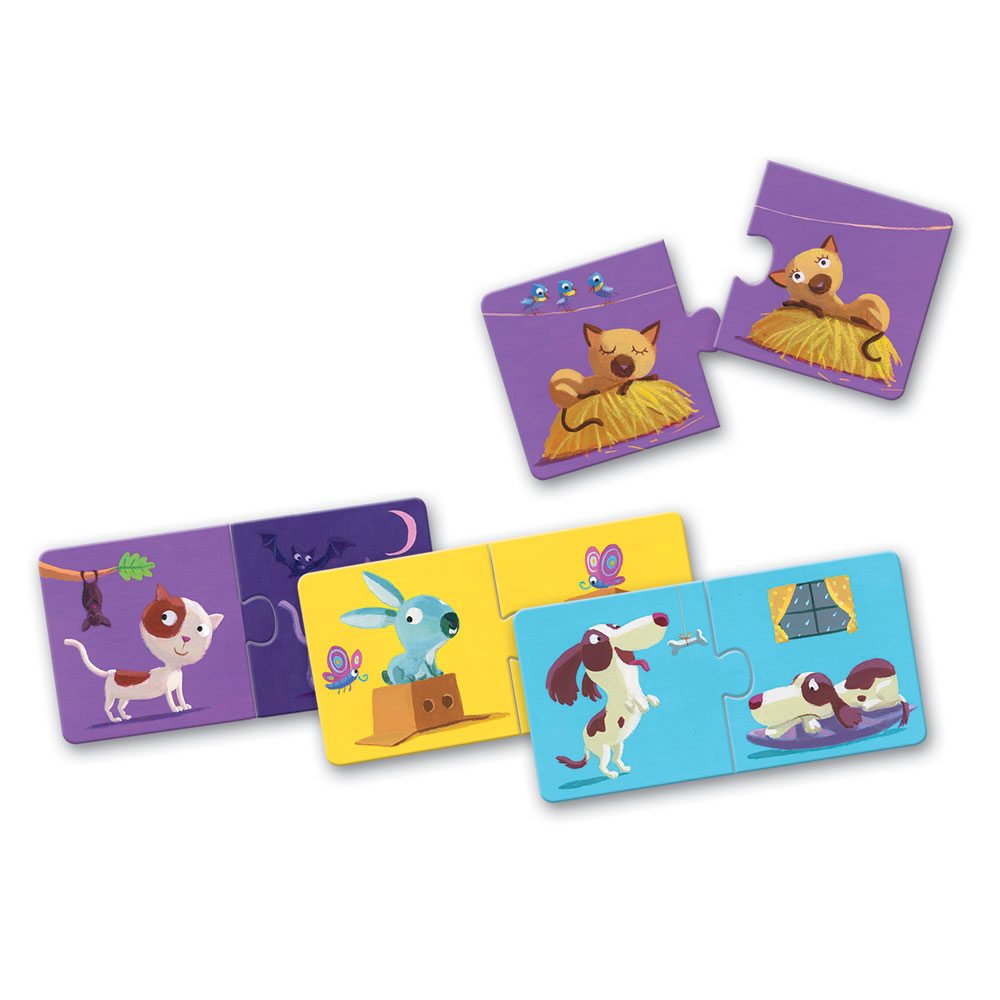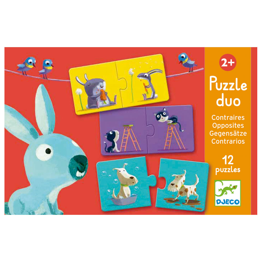 Μαθαίνουμε τα αντίθετα! Παζλ από χοντρό πεπιεσμένο χαρτόνι της εταιρίας Djeco. Περιλαμβάνονται 12 παζλ αποτελούμενα από 2 κομμάτια το καθένα. Κατάλληλο από 2 ετών και άνω.